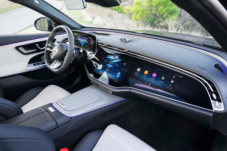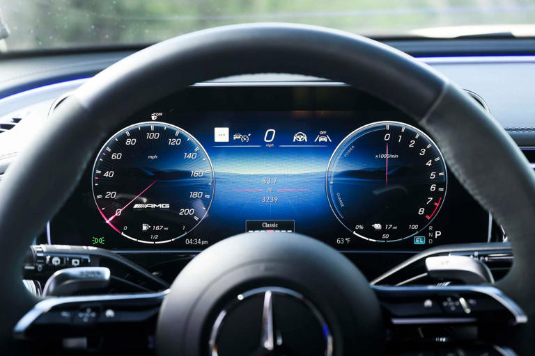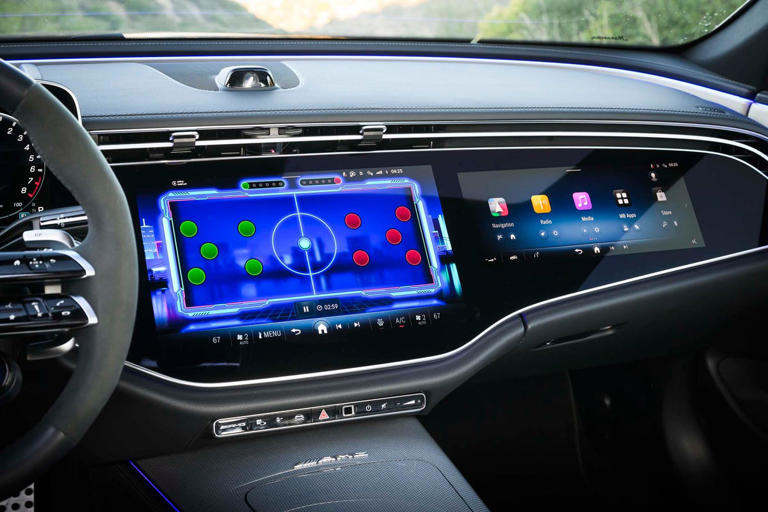 Нашият Mercedes-AMG E53 комби от 2026 г. беше оборудван с опционалния пакет MBUX Superscreen, технологично подобрение, което превръща таблото в истински команден център. В допълнение към стандартния 14,4-инчов централен информационно-развлекателен дисплей и 12,3-инчовия дигитален инструментален панел, Superscreen добавя специален екран от страната на пътника, който визуално разширява кабината.
